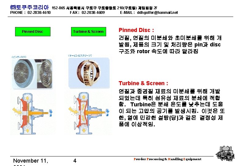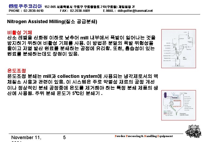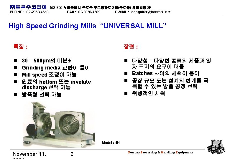 152 865 210 2 F PHONE 02 2038 Slides: 7 Download presentation ㈜토쿠주코리아 152 -865 서울특별시 구로구 구로중앙로 210(구로동) 제일빌딩 2 F PHONE : 02 -2038 -4610 FAX : 02 -2038 -4609 E-MAIL : ddhgolfer@hanmail. net High Speed Grinding Mills UNIVERSAL MILL November 11, 1 Powder Processing & Handling Equipment ㈜토쿠주코리아 152 -865 서울특별시 구로구 구로중앙로 210(구로동) 제일빌딩 2 F PHONE : 02 -2038 -4610 FAX : 02 -2038 -4609 E-MAIL : ddhgolfer@hanmail. net Universal Mill Motor Sizes Model Size Grinding Rotor Mill Speed rpm Grinding Rotor max Turbine / Screen Grinding Rotor max Pin & Disc Rotor Size mm Turbi ne & Scree n Pin & Disc Model : 5 H 5 H 3. 7 kw 19000 120 133 4 H 7. 5/11 kw 10000 220 250 3 H 15/18. 5/2 2 kw 6000 8000 371 330 2 H 37/45 kw 4000 570 510 Model : 4 H November 11, 3 Powder Processing & Handling Equipment ㈜토쿠주코리아 152 -865 서울특별시 구로구 구로중앙로 210(구로동) 제일빌딩 2 F PHONE : 02 -2038 -4610 FAX : 02 -2038 -4609 E-MAIL : ddhgolfer@hanmail. net Nitrogen Assisted Milling System STOCK TANK EXHAUST BLOWER ROTARY VALVE LN 2 TANK FLOW CONTROL VALVE LN 2 SPRAYING DEVICE RB DUST COLLECTOR FLOW CONTROL VALVE FINE GRINDING MILL HOPPER ROTARY VALVE CONTAINER November 11, 6 Powder Processing & Handling Equipment ㈜토쿠주코리아 152 -865 서울특별시 구로구 구로중앙로 210(구로동) 제일빌딩 2 F PHONE : 02 -2038 -4610 FAX : 02 -2038 -4609 E-MAIL : ddhgolfer@hanmail. net Nitrogen Assisted Milling System EXHAUST BLOWER LN 2 TANK ROTARY VALVE FLOW CONTROL VALVE STOCK TANK CRYOGENIC FEEDER COMPRESSOR ROTARY VALVE FLOW CONTROL VALVE DUST COLLECTOR FINE GRINDING MILL HOPPER ROTARY VALVE CONTAINER November 11, 7 Powder Processing & Handling Equipment