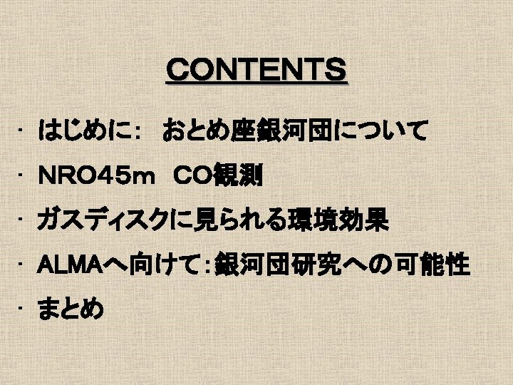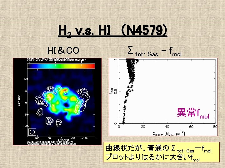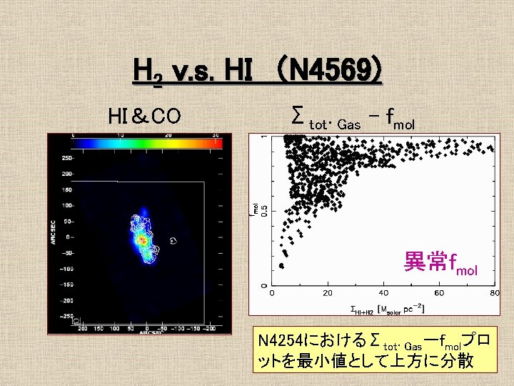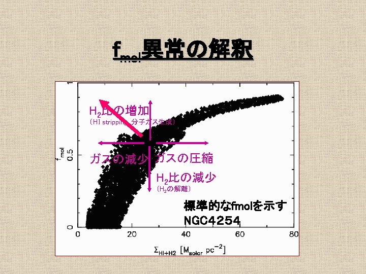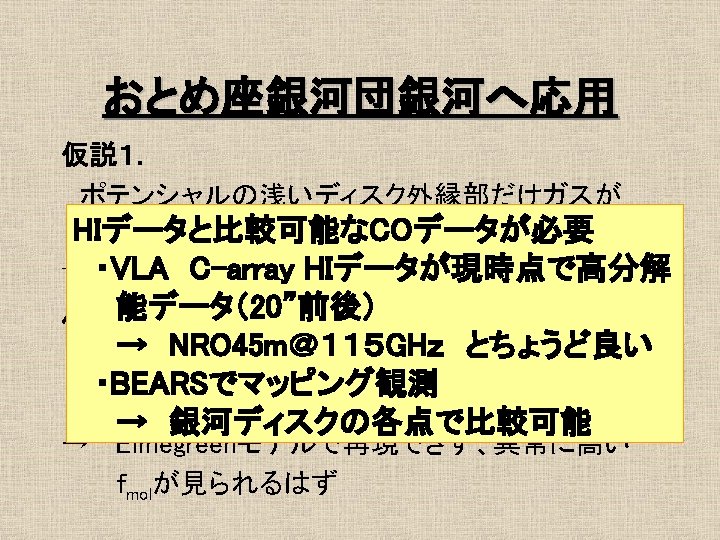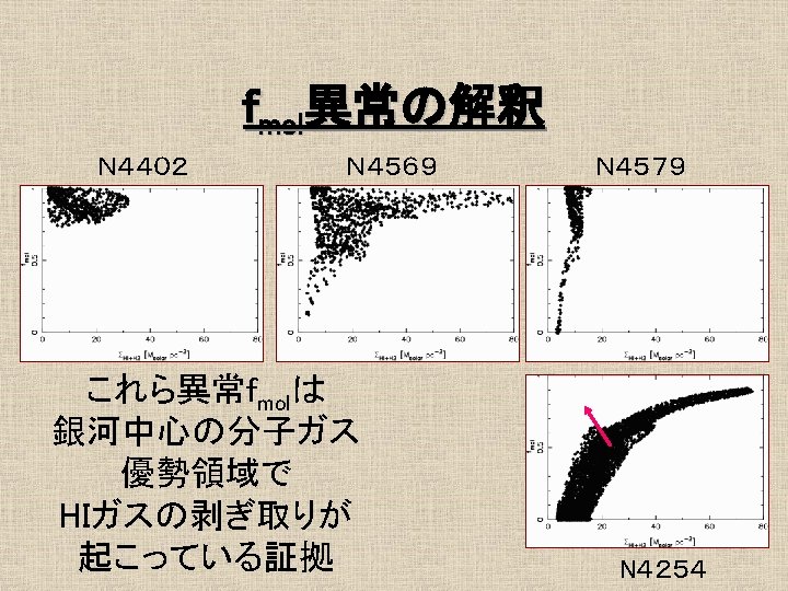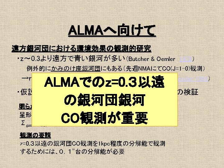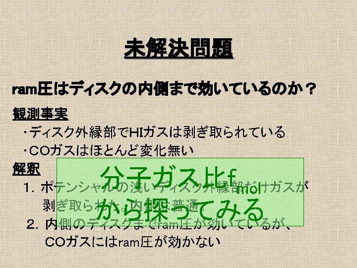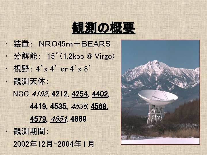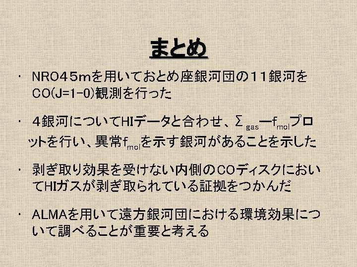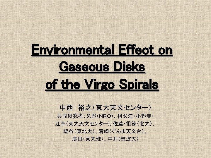 16 1 Mpc Ferrarese et al 1996 No Slides: 21 Download presentation おとめ座銀河団の概要 • 距離 16. 1 Mpc Ferrarese et al. 1996 最も近い銀河団 • • No. E/S 0 66 No. S/Ir 91 σv = 715 km/s Rvir = 730 kpc Tully et al. 1996 約4° ガスディスクの研究 1 • HI観測 Helou et al. 1981 @ Arecibo Warmels 1988 @ WSRT Cayatte et al. 1990 @ VLA → 銀河団中心に近い ほどHIガスが少ない log. MHI (isolated) = 7. 01 + 0. 88 log. DHo HI def = log. MHI(isolated) – log. MHI (actual) (Giovanelli & Haynes, 1983) ガスの剥ぎ取り効果 • Ram Pressure Stripping 銀河間には希薄な高温ガス ← X線による観測 Böhringer et al. 1994 η = f. ICM/fgrav = (n. ICM/n. ISM)(V/Vrot)2 cosαsinα → η >1 → ram pressure stripping ガスディスクの研究2 • COガス観測 Kenney & Young 1988 @ FCRAO Nishiyama et al. 2000 @ NRO 45 m Sofue et al. 2003 @ NMA COガスディスクはあまり 影響を受けていない 結果/COデータ CO images CO atlas H 2 v. s. HI (N 4254) HI&CO Σtot. Gas - fmol 普通のfmol曲線 fmolはΣtot. Gasの一価関数 H 2 v. s. HI (N 4402) HI&CO Σtot. Gas - fmol 異常fmol 普通のΣtot. Gas一fmolプロットより はるかに大きいfmol