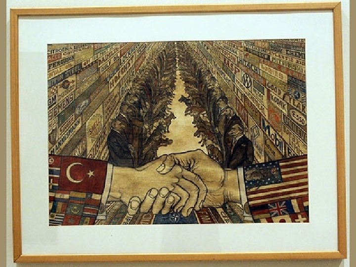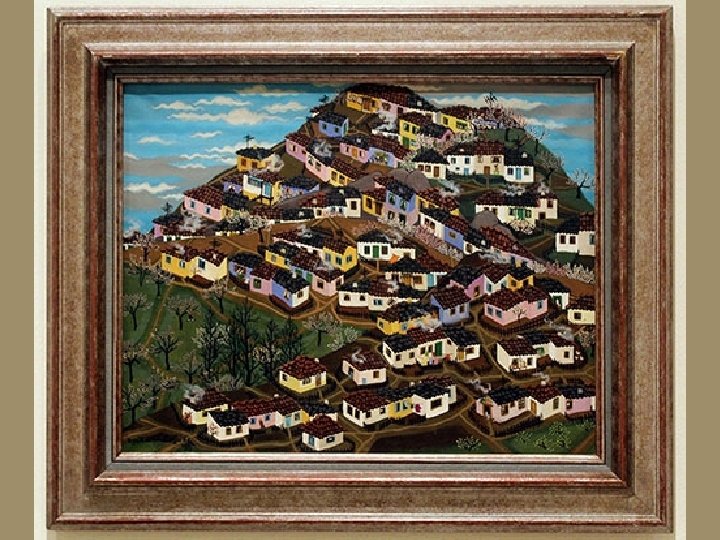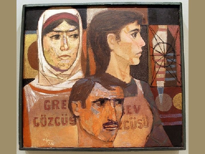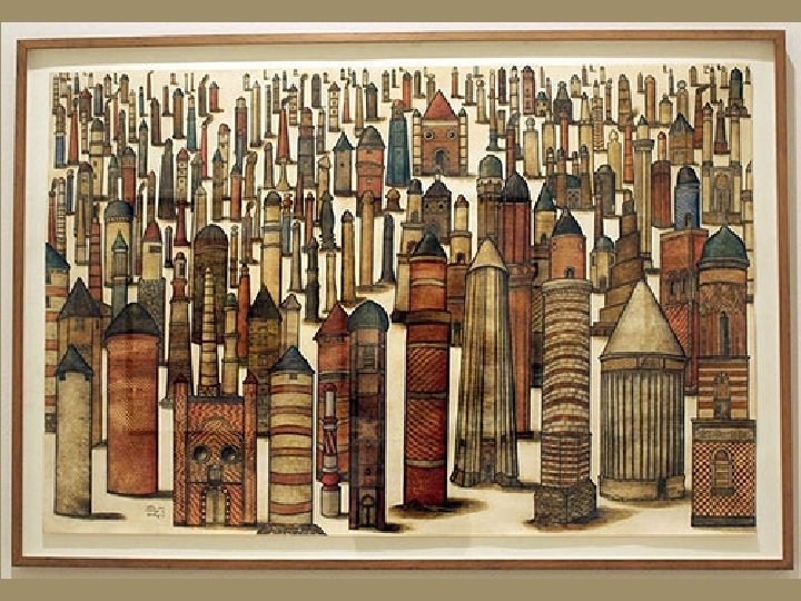 AR F: GECEKONDULU HAYAT THE PURGATORY : LIFE WITH SLUMS Kırsal kesimden 1950’lerde başlayan göç, 1960’larda kent mekânını gecekondu bölgeleriyle kuşatır. Gecekondu, ne köylü ne de kentlidir; geriye dönüşü olmayan, ama geleceği de belirsiz bir toplumsal hayatın kozasını temsil eder. Bu koza içindeki yaşam alanları adeta birbiri üzerine yığılmıştır. Cumhuriyet imgesi köy hümanizminden koparak bu yeni hayatın kozasına yerleşir. Üst üste yığılan gecekondular, günümüzde inşa edilmiş Babil Kulesi’ni andırırlar. Modern resim bu yığılmayı görsel dile, minyatür sanatındaki tekniğini kullanarak dönüştürür. Gerçekten Bedri Rahmi Eyüboğlu, Turan Erol, Nuri İyem ve Oya Zaim Katoğlu’nun resimlerinde geleneksel teknikle çalışan nakkaşın tarzını görmek mümkündür. Gecekonduların topografik konumuyla Matrakçı Nasuh’un mekân istifi arasında yakın bir paralellik vardır. The migration from rural areas began in the 1950 s , and by the 1960 s, the cities became surrounded with slum areas. The slum is neither rural nor urban; it represents the cocoon of a social life from which there is no return, but whose future is also uncertain. The life-spaces within this cocoon seem like stacked up on each other. The image of the Republic severs itself from rural humanism to settle down in the cocoon of this new life. The slums rising on top of each other remind one of the Tower of Babel. Modern painting converts this conglomeration into a visual language by using the composition technique of miniatures. It is in fact possible to see in the paintings of Bedri Rahmi Eyüboğlu, Turan Erol, Nuri İyem, and Oya Zaim Katoğlu the style of a nakkaş working with the classical technique. There exists a parallel between the topographic placement of the slums and Matrakçı Nasuh’s spatial composition.