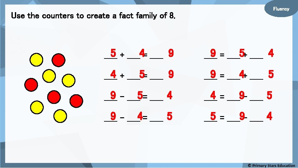 Fluency 5 + 4 = 9 9 = 5 + 4 4 + 5 = 9 9 = 4 + 5 - 5 = 4 9 - 4 = 5 5 = 9 9 - 4 4 = 9 - 5