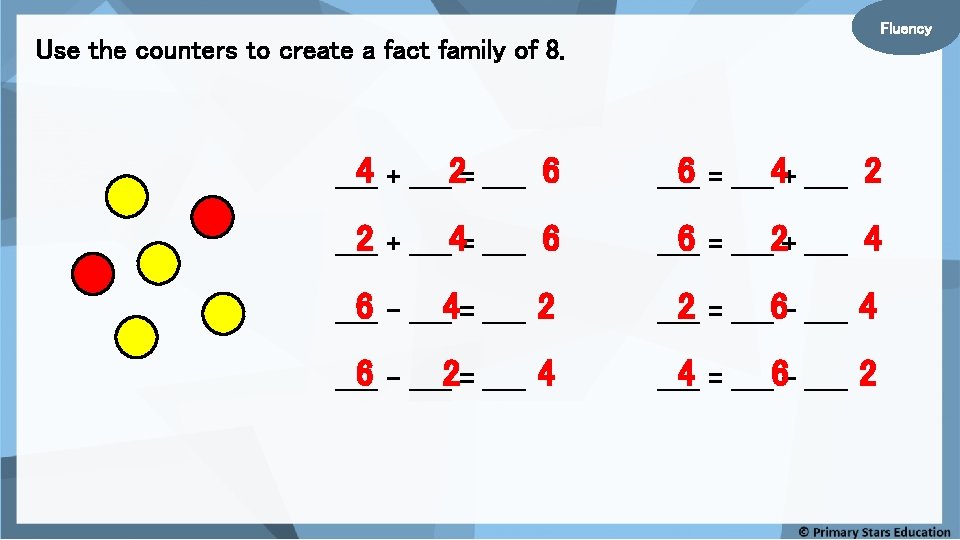 Fluency Use the part-whole model to create a fact family of 8. 6 4 2 4 + _____2= _____ 6 6 = _____4+ _____ 2 2 + _____4= _____ 6 6 = _____2+ _____ 4 6 – _____4= _____ 2 2 = _____6– _____ 4 6 – _____2= _____ 4 4 = _____6– _____ 2