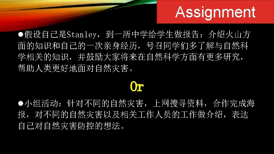 nd 2 Reading • The experience of Stanley 1. What does Stanley Williams do? 2. Where were Stanley and his team that day? 3. According to Stanley’s working experience, can you describe the process of volcano erupting? 4. What happened to Stanley at that time? 5. Why does the author say “Stanley, however, was lucky”?