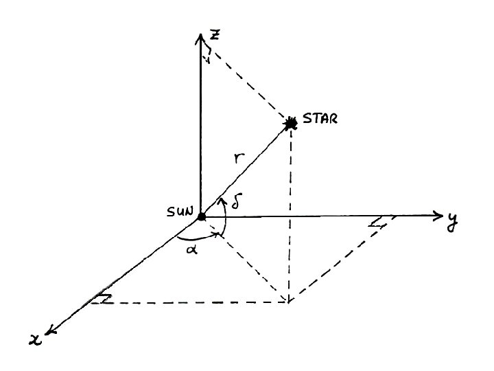 The velocity components of a star with respect to the Sun are: X*–X , Y*–Y , and Z*–Z , which can be derived from the temporal derivatives of the basic equations, i. e. : Clearly, terms in dr/dt are equivalent to radial velocities v. R, while terms in dα/dt and d /dt are equivalent to the proper motions μα and μ . The above equations can therefore be simplified and inverted by matrix algebra to the following form: