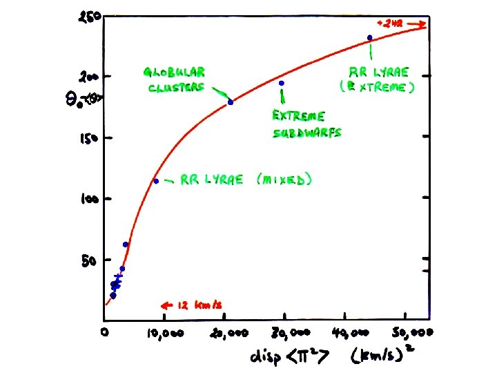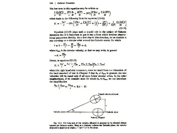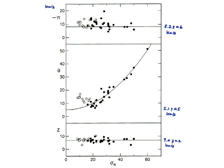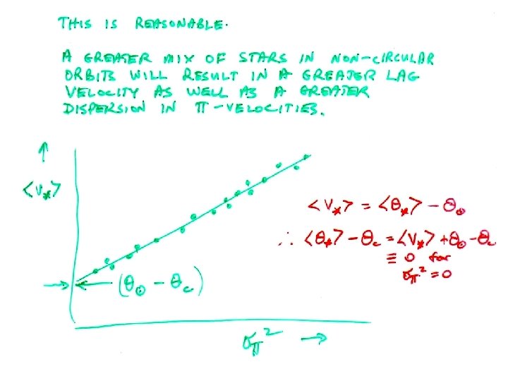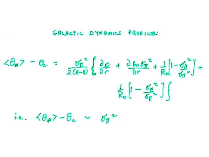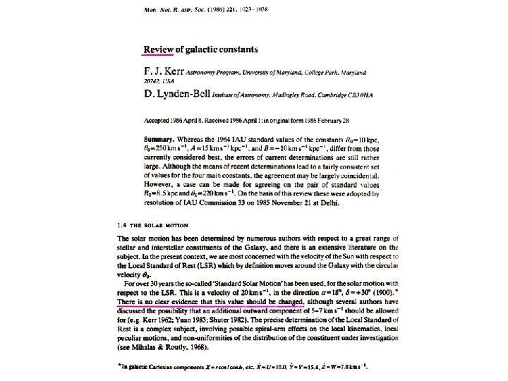 Solar Motion Relative to the Dynamical LSR. As pointed out previously, the asymmetric drift of local groups of stars relative to the LSR results in values for v' that are larger than v. Dynamical modeling can be used to relate the drift of a group with respect to the local circular velocity to the local Galactic rotation constants A and B, the distance R 0 to the Galactic centre, the local density gradient of stars ρ(R 0), and the measured dispersions σΠ, σΘ, and σZ in the Π, Θ, and Z velocities. As derived in Mihalas: i. e. , <v*> ~ σΠ 2, so a plot of <V*> (= <v*> – v ) versus σΠ 2 for various kinematical groups in the disk should be linear with an intercept for σΠ 2 = 0 given by –v.