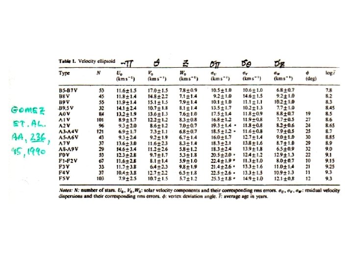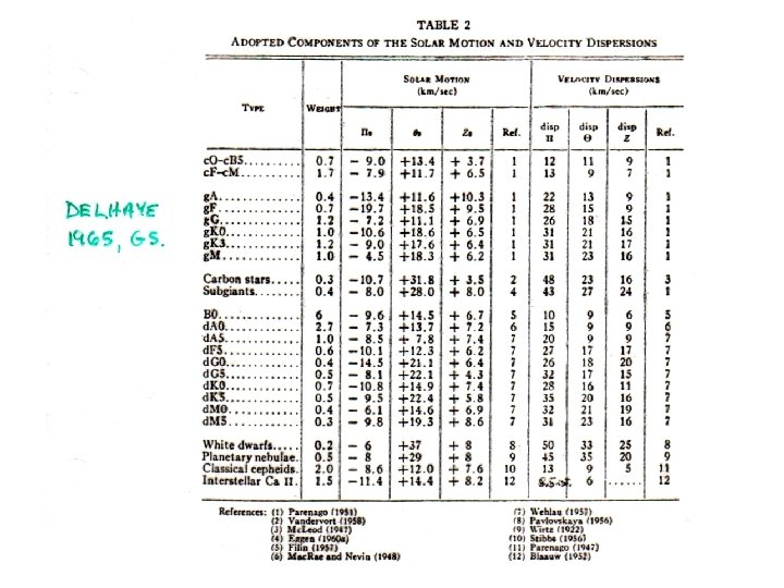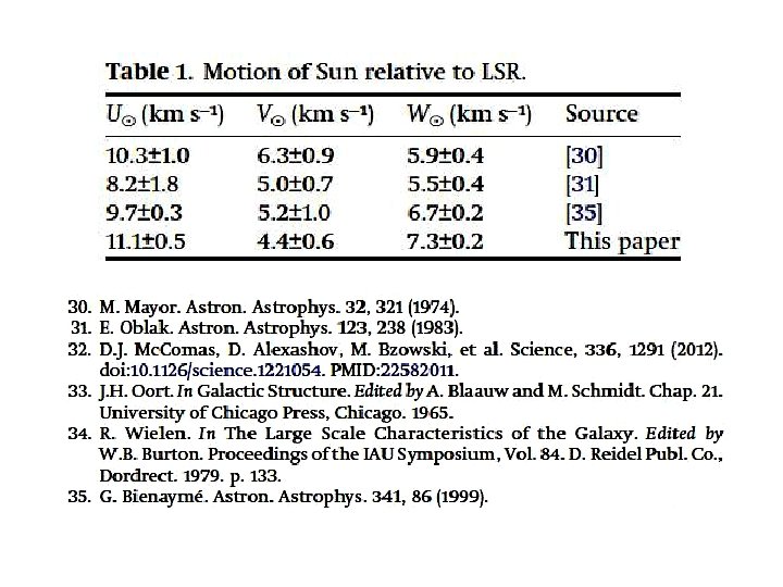 Standard Solar Motion. The solar motion relative to stars forming the majority of objects in general catalogues of radial velocity and proper motion is referred to as the standard solar motion. It is based upon the derived space velocities of A to G-type dwarfs, giants, and supergiants, which yield: ustd = – 10. 4 km/s , [– 10. 9 ± 0. 5 km/s, Gomez et al. (1990)] v'std = +14. 8 km/s , [= v. LSR + x] wstd = +7. 3 km/s , [+7. 1 ± 0. 3 km/s, Gomez et al. (1990)] corresponding to S = 19. 5 km/s towards lstd = 56º, bstd = +23º. It not identical to the Sun’s motion relative to the LSR, but is neverthelesss an interesting parameter. Radio astronomers have erroneously adopted it as the LSR motion of the Sun, and many studies of Galactic structure have been based upon that value. The inhomogeneity of stars defining this motion for the Sun is evident in their large velocity dispersions. They do not represent a sample of stars in circular motion about the Galactic centre.