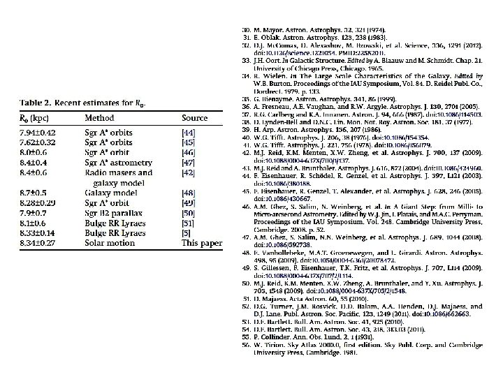 v. by determining the peculiar velocity of the Sun relative to nearby galaxies in the Local Group. It is not as simple a task as it might seem, owing to the intrinsic velocities of other galaxies in the system. An estimate of the local circular velocity from such an analysis is that of Arp (A&A, 156, 207, 1986), who finds 0 = 246 ± 17 km/s, but our recent reanalysis finds 0 = 252 ± 17 km/s. vi. by using best estimates for Oort constants A and B, since 0 = (A – B)R 0. Clearly, an analysis of this type depends upon a concurrent best estimate for R 0, and assumes that both A and B are well-determined. Most current estimates for R 0 lie in the range 7– 10 kpc, while Oort’s A and B constants appear to lie in the range 10 km/s/kpc ≤ A ≤ 20 km/s/kpc and – 15 km/s/kpc ≤ B ≤ – 7 km/s/kpc, i. e. 119 km/s ≤ 0 ≤ 350 km/s. With more recent best estimates of A = 12. 32– 14. 22 km/s/kpc and B = – 11. 85 km/s/kpc derived by Schwan (A&A, 198, 116, 1988), the range is further reduced to 169 km/s ≤ 0 ≤ 261 km/s.