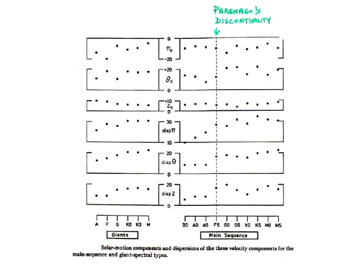 The actual situation is somewhat more complicated because of the spiral density enhancement of stars in the Galaxy, and ideally only well-mixed groups that have orbited the Galactic centre at least once appear to yield an uncontaminated value for v. Evidence for the distinct nature of older stars from those that have not traveled far from their places of birth can be found in Parenago’s discontinuity, which marks a distinct increase in the velocity dispersions of main-sequence stars of spectral types F 5 and later relative to hotter stars. A similar break is evident for giant stars of spectral types G and later. The best results for the components of the solar motion relative to the dynamical LSR found from a proper consideration of all factors are (from Turner): u = – 8. 2 ± 0. 6 km/s v = +5. 1 ± 0. 5 km/s w = +7. 0 ± 0. 2 km/s giving S = 11. 9 km/s towards l. LSR = 32º, b. LSR = +36º.