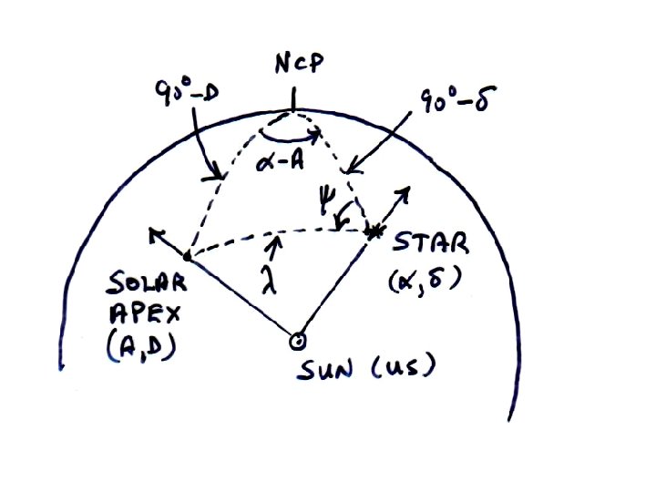 17. Statistical and Secular Parallaxes Trigonometric parallaxes are derived from observable annual parallactic displacements of stars in the sky resulting from the Earth’s orbital motion about the Sun. The systematic motion of the Sun with respect to the local system of stars results in secular displacements in the sky of the observed positions of nearby stars, namely a large part of their observable proper motions. The proper motion of any star therefore has two components — one which is a reflection of the Sun’s motion relative to it, and the other arising from its own peculiar motion. Denote a star’s coordinates (right ascension and declination) by and , and the coordinates of the solar apex by A and D. Denote the angular distance of a star from the solar apex by , and let represent the angle between the great circles joining the star to the north celestial pole (NCP) and the solar apex, where the angle is positive if measured from north through west (diagram).