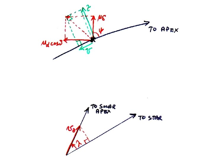 If the group of stars is truly randomly distributed in space, then we expect that: So: A solution for < > in this instance requires only a knowledge of the proper motions and positions of stars and the direction of the apex of motion (A, D) and velocity of the Sun v relative to the stars in the group. It is somewhat easier to use the terminology: