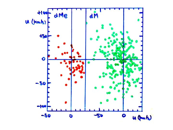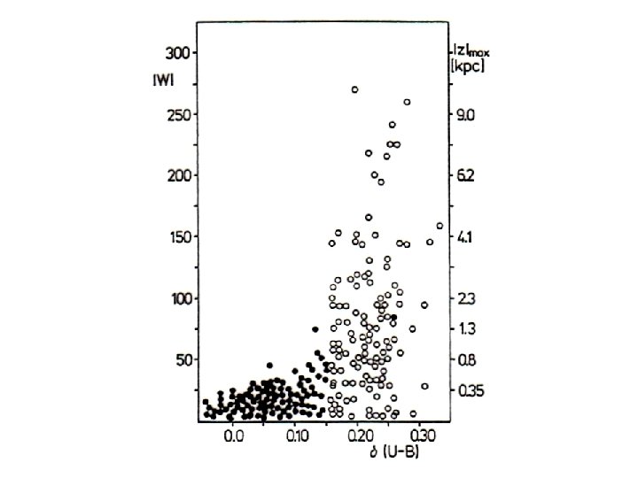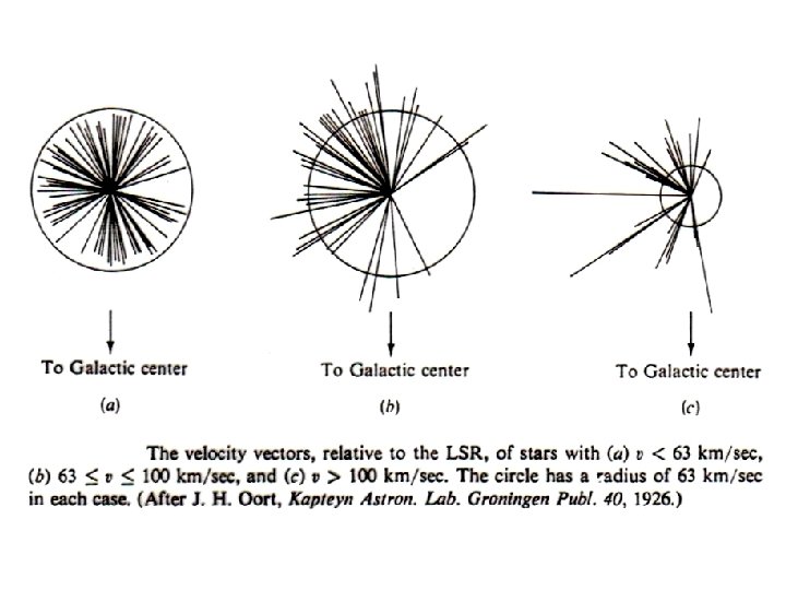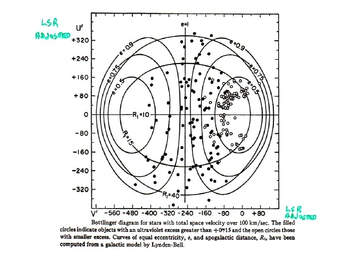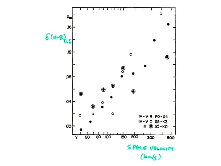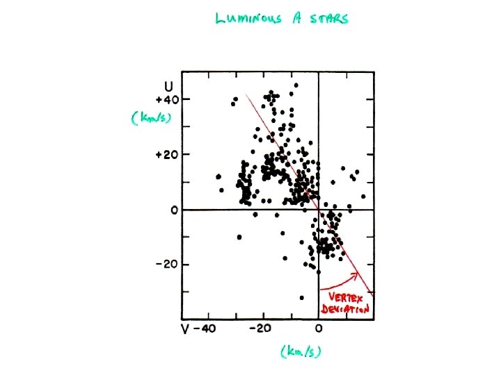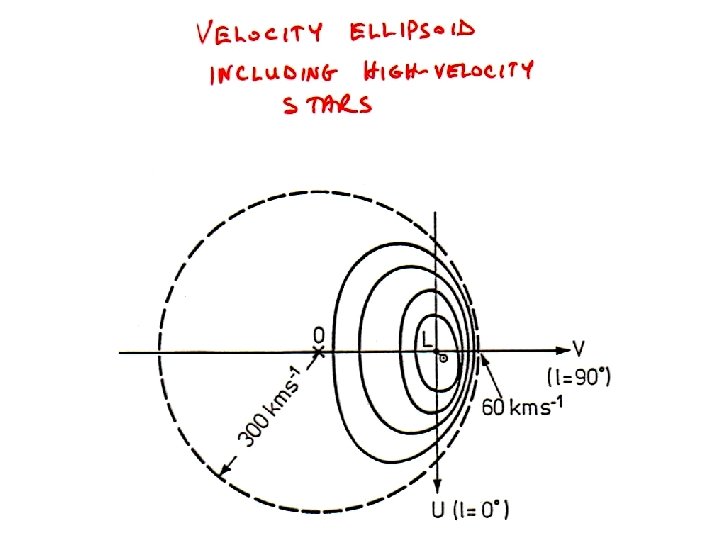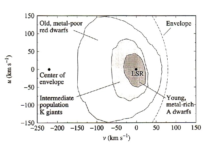 18. Kinematic Groups Once the LSR velocity of the Sun is established, it is possible to plot the space motions of various types of stars relative to the LSR. The corresponding u, v, and w velocities always exhibit scatter, i. e. the velocities have associated dispersions u, v, and w, typically such that u > v and u > w. The resulting distribution of LSR velocities describes an ellipsoidal cloud with the w-axis (Z -axis) directed towards the Galactic poles. The observed distribution of space velocities relative to the LSR is referred to as the velocity ellipsoid. The standard method of examining the velocity ellipsoid of nearby stars is to plot the space velocities as projected on the Galactic plane. The resulting distribution of u and v velocities is expected to display an elliptical form with u > v and with the principal axis directed towards the Galactic centre.