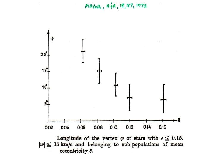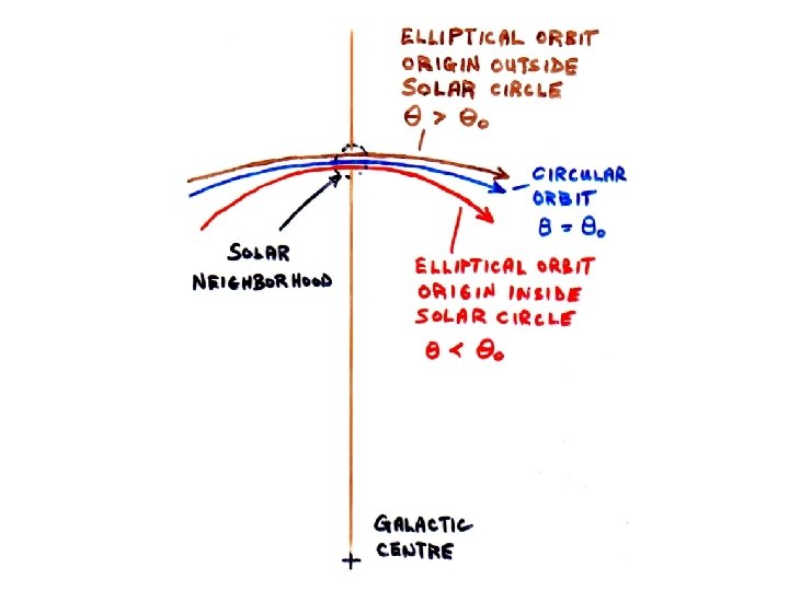 Since the apogalacticon velocity of stars in elliptical orbits is less than the local circular velocity Θc, any mix of elliptical orbits for nearby stars will find the majority traveling at less than Θc in the direction of the Sun’s orbital motion. It follows that locally-defined kinematic groups of stars should, in general, tend to lag behind the LSR motion. Such an asymmetric drift is well-observed in most groups of stars, and must be taken into account in any determination of the Sun’s LSR velocity. The lag of a kinematic group of stars relative to the solar LSR, namely its asymmetric drift, is defined by: <v*> = <Θ*> – Θc = –x, where x is the lag velocity. Thus, u = <u*> – <U*> = –<U*> , v = <v*> – <V*> = –x – <V*> , w = <w*> – <W*> = –<W*>.