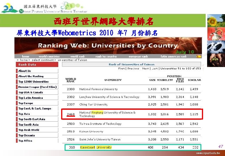 2010 World University Rankings QSAsian ESI (Asian) Webometrics SCI Mago 臺大 21 60(9) 139 76 台科大 56 700(170) 1014 - 中山 62 522(108) 437 - 中興 109 517(105) 635 548 海大 181 999(271) 1346 1022 暨南 191 1995(560) 1324 1910 屏科大 >200 >3200 2468 > 2124 http: //www. topuniversities. com/university-rankings/asian-university-rankings http: //www. webometrics. info/top 100_continent. asp? cont=asia http: //epaper. heeact. edu. tw/archive/2010/05/01/2860. aspx 46 www. npust. edu. tw