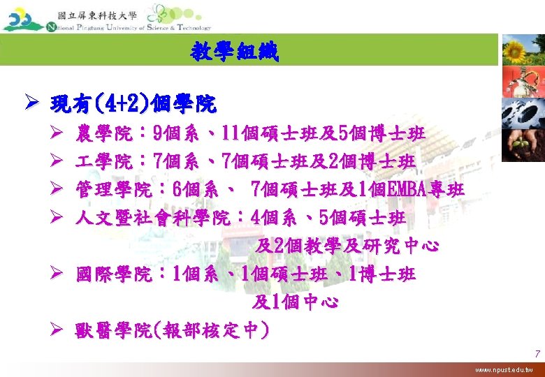 Comparison Table 創校年 學生數(研究所/大學部) KU 1 NPUST 2 1943 1924 10, 480/39, 530 2, 356/8, 693 154 教師數 2, 839 372 系所數 101 36 經費 (Million US$) 75. 39 41. 77 校園面積(ha) 4, 814 1, 158 QS World University Rankings (Asian) 126 >200 Webometrics 310 2468 外籍生人數 Ps, 1. 2007年數據 2. 2010 49 www. npust. edu. tw