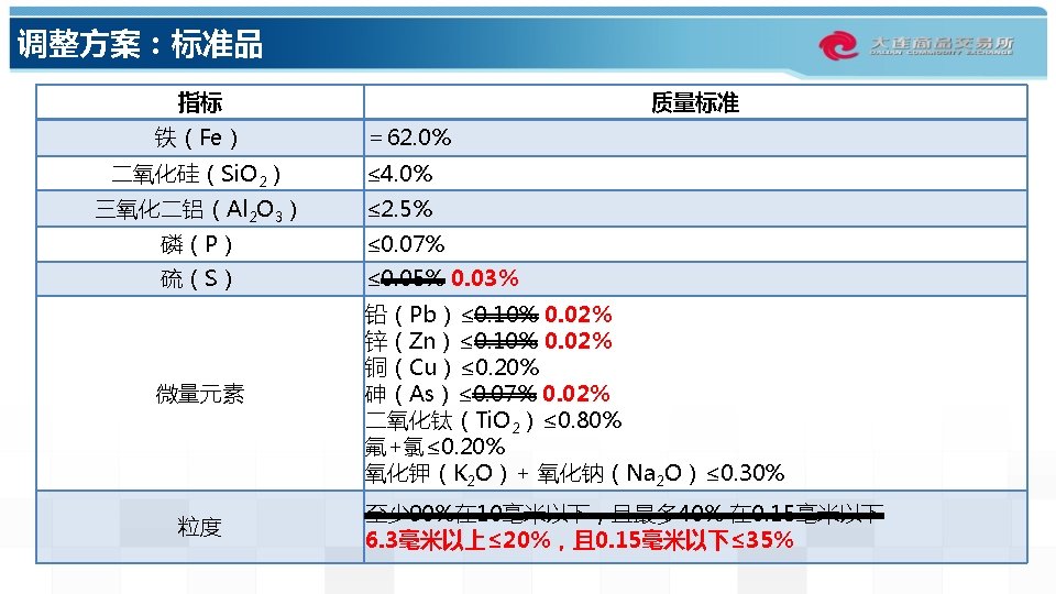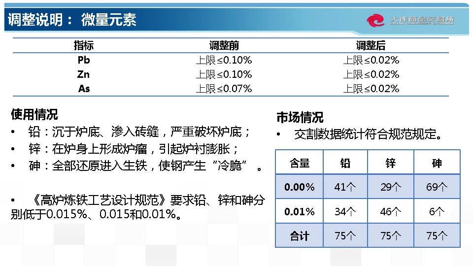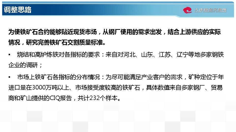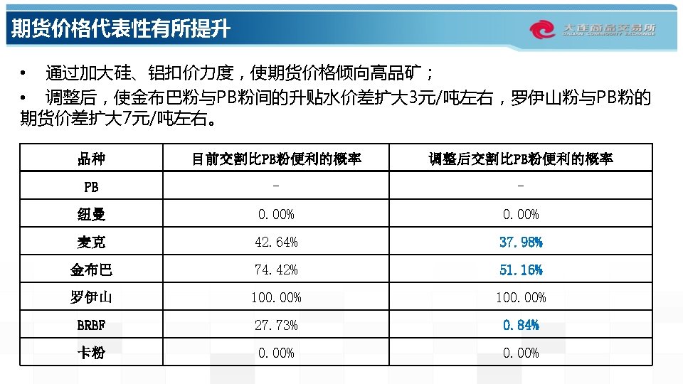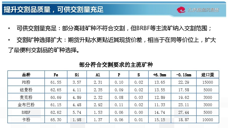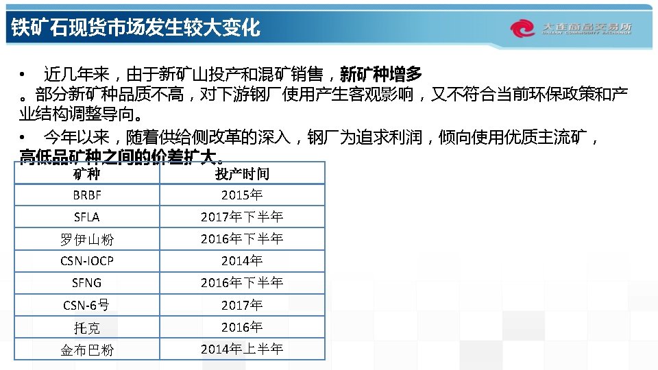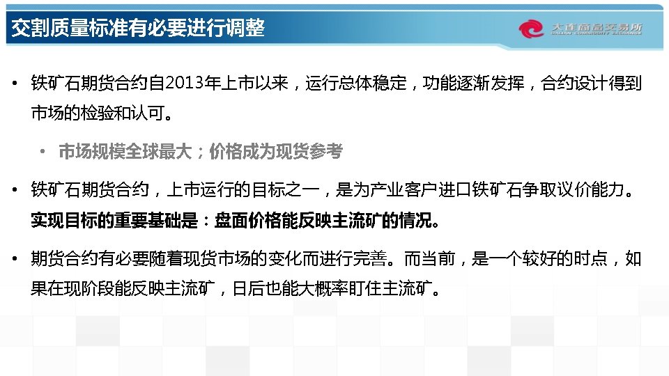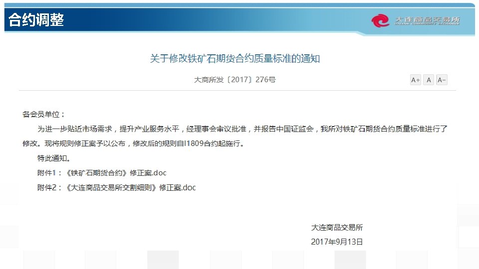 16011705 1705 90 1705 80 60 40 20 Slides: 22 Download presentation 对期货市场产生影响 • 固定的期货升贴水价差已无法覆盖目前的异常扩大的现货价差,最便利交割品变化。 • 1601合约的最便利交割品是卡粉,1705合约的最便利交割品是金布巴粉。 • 期货价格代表性变差。 • 1705合约之前,主流矿比例占 90%以上; 1705合约交割大量新矿种。 80 60 40 20 0 PB-I 701 PB-I 705 PBPBPB-PBPBI 701 PBI 705 PB- 6 PB 8 I 705 30 PBPB 29 PBPBI 705 PBPBPB-97 PB 1110 I 705 1 I 705 5 PB-PBPB 68, 28 68, 22 PBPB 72, 56 PBI 705 70, 56 PBPBI 705 I 701 I 705 PBPB 61, 89 I 705 PB-PBI 701 I 705 65, 78 60, 443 4 I 701 PB 65, 11 60, 00 3028 I 705 59, 22 I 705 I 705 I 701 PBI 705 12 I 705 17 PB 25 28 PB 29 PBPBI 705 I 701 2322212019 I 701 PBI 701 50, 17 I 701 54, 89 49, 72 15 13 27 PB 16 51, 89 I 705 24 50, 56 20 18 49, 83 PBI 705 2 49, 11 49, 00 I 701 PB 48, 39 I 701 2625 1817 11 23 46, 33 27 46, 11 I 701 45, 89 45, 11 44, 11 43, 67 PB 43, 00 42, 83 42, 56 I 701 34, 06 42, 33 42, 11 42, 00 41, 78 14 41, 39 39, 89 I 701 16 26 1210 PB 37, 78 37, 44 37, 33 37, 22 36, 11 PB- 2 I 701 35, 50 34, 94 I 701 13 8 31, 50 PB-93 15 I 701 7 28, 39 28, 11 4 27, 83 I 701 5 14 25, 78 PB 18, 39 17, 50 22, 28 16, 72 I 701 6 19, 39 13, 72 12, 89 12, 78 10, 781 15, 78 I 701 5, 72 3028262422201816141210 8 6 4 0, 00 2 其他; 33; 10% 卡粉; 92; 29% 金布巴 麦克粉; 粉; 28; 22; 7% 9% PB粉; 100; 31% �曼粉 ; 46; 14% 1705合约之前 巴粗SF 托克; NG; 4; 1; 3% 13% �伊山 ; 12; 37% 1705合约 金布巴 ; 15; 47%