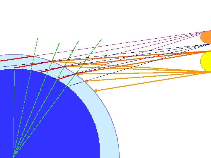 Total Internal Reflection l When light goes from a medium with high n into a medium with low n, rays bend away from the normal. l At a particular incident angle (critical angle c), the refracted angle becomes exactly 90°. air n 2 ( < n 1) n 1 c water l At angles greater than c there is no refracted ray at all. The incident rays are completely reflected !! çthis is total internal reflection