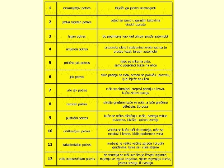 MJERENJE JAČINE POTRESA dva načina: intenzitet i magnituda potresa 1. MERCALLI-CANCANI-SIEBERG - ova (MCS) ljestvica - empirijska, subjektivna - prikazuje intenzitet potresa veličina i vrsta štete - učinak potresa na ljude, objekte i tlo I – XII stupnjeva I – III stupnja IV – VI stupnja VII – IX stupnja X – XII stupnja slabi potresi srednji potresi jaki potresi katastrofalni potresi
