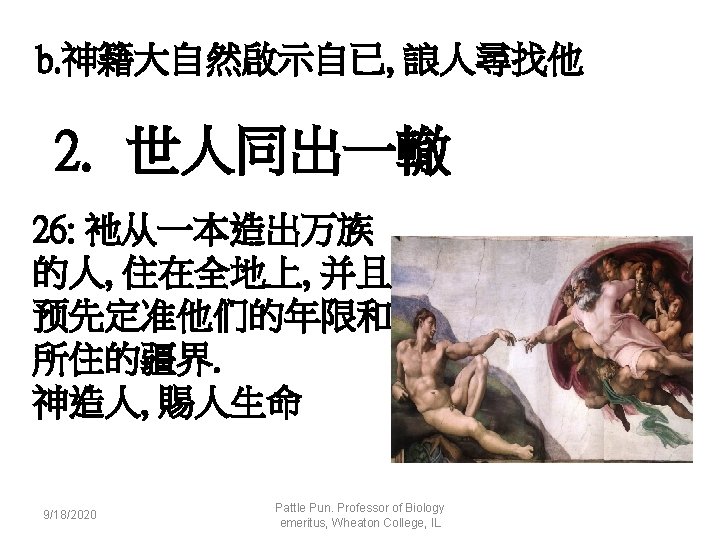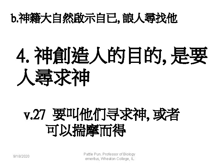 b. 神籍大自然啟示自已, 誏人尋找他 1. 神创造宇宙和其中万物: V. 24 9/18/2020 Pattle Pun. Professor of Biology emeritus, Wheaton College, IL
