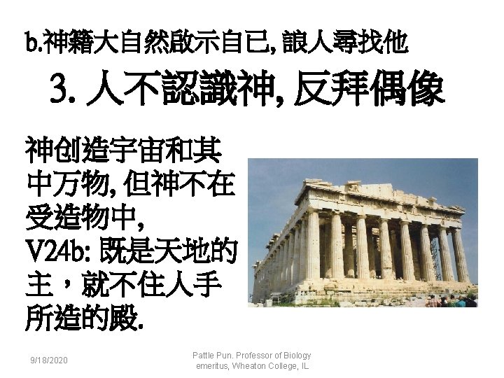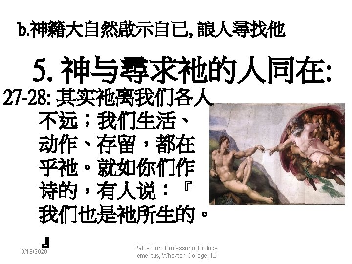 III. 保羅雅典演說的論据: b. 神籍大自然啟示 自已, 誏人尋找他 9/18/2020 Pattle Pun. Professor of Biology emeritus, Wheaton College, IL