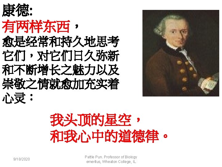 Robert Jastrow Astronomer NASA and Columbia University “科學家在攀登無知的高山, 他將要 征服最高的山巔, 但當他爬上最後一 個山峰, 卻發現一群神學家已在山頂 上等候他數千年之久. ” 9/18/2020 Pattle Pun. Professor of Biology emeritus, Wheaton College, IL