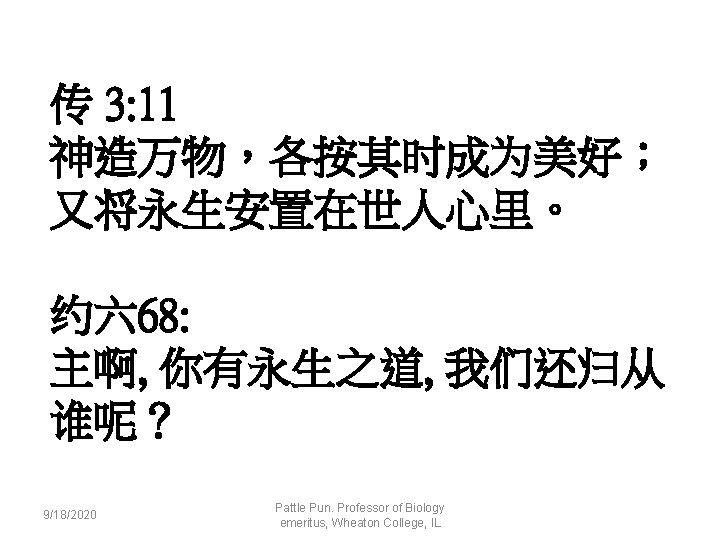"你為你自己創造 我們, 我們的心 不能安息, 直到 安息在你裡面" AUGUSTINE 9/18/2020 Pattle Pun. Professor of Biology emeritus, Wheaton College, IL