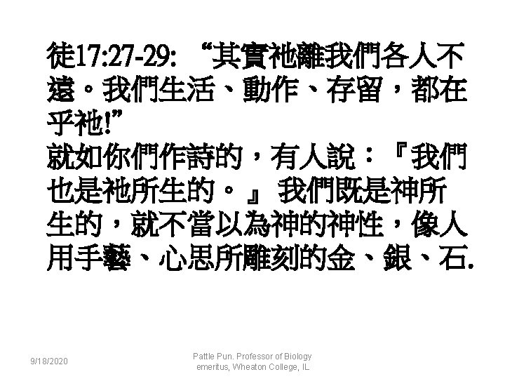 徒Acts 17: 30 -31 徒Acts 17: 24 -29 9/18/2020 Pattle Pun. Professor of Biology emeritus, Wheaton College, IL