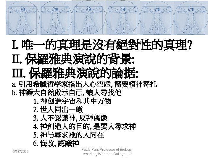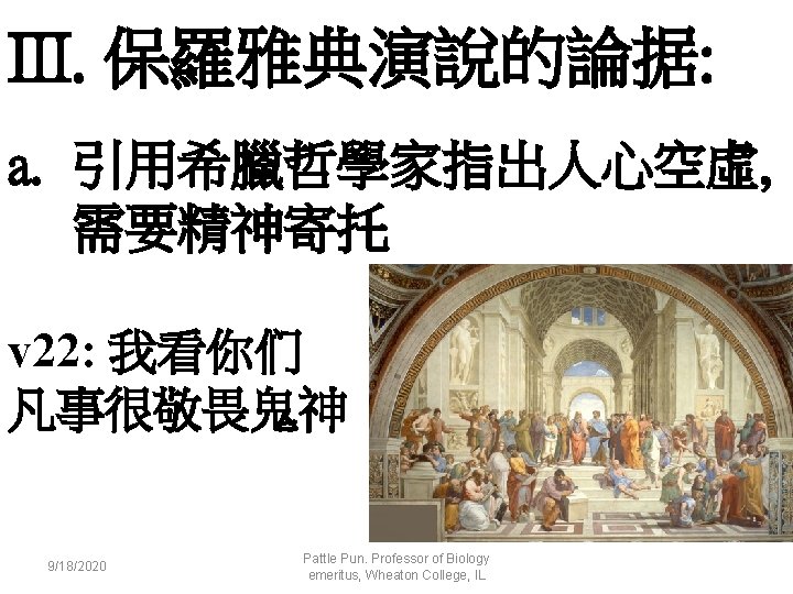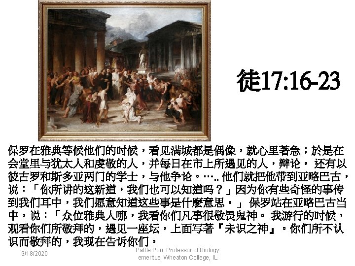 II. 保羅雅典演說的背景: 希羅文化 多神論, 笑一神論 專崇知識 人只要知就行, 无罪 9/18/2020 Pattle Pun. Professor of Biology emeritus, Wheaton College, IL