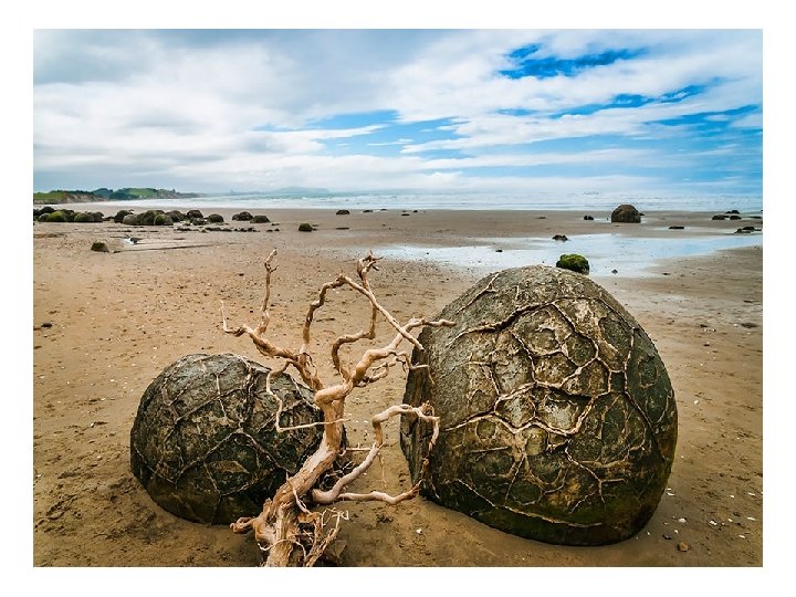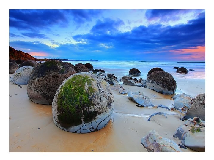 Playa Koekohe, Nueva Zelanda Las grandes piedras Moeraki (Huevos de Dragón) Las rocas en esta playa de Nueva Zelandia son grandes bolas de roca sedimentaria más dura que la tierra sedimentaria que se formó a su alrededor, la cual ha sido lavada y removida a lo largo de los siglos.