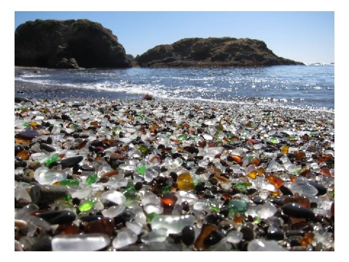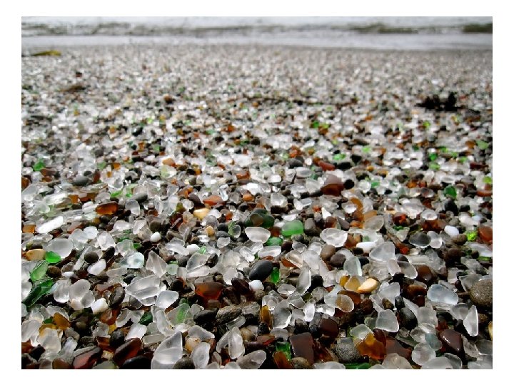 Playa de Vidrio en California La playa de vidrio cerca de Fort Bragg en California es fruto de la basura arrojada en ella durante años por los residentes locales, cristales golpeados infinidad de veces en la arena por el oleaje. El arrojar deshechos finalmente (y felizmente) se prohibió, pero la arena de vidrio permanece.
