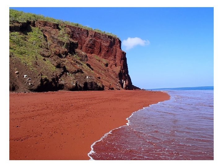 Playa de Arena Roja, RAbida, Islas Gal. Apagos La arena roja de Rábida (Islas Galápagos) se formó debido a la oxidación de los depósitos de lava ricos en hierro, aunque también podría ser debido a los sedimentos de coral.
