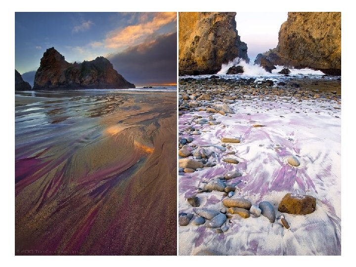 Playa de Arena Púrpura Pfeiffer, en California La arena púrpura de esta playa (que sólo se encuentra en parches) se forma cuando los depósitos de granate de manganeso en las colinas de los alrededores se erosionan en el mar.