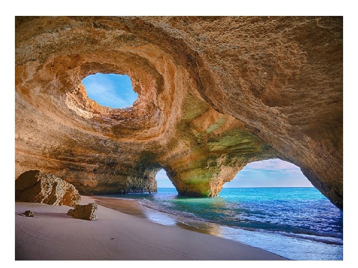 Playa de la Cueva en Algarve, Portugal La costa portuguesa del Algarve se compone de piedra caliza, la cual se erosiona fácilmente y puede formar impresionantes cuevas de mar como ésta de la imagen.