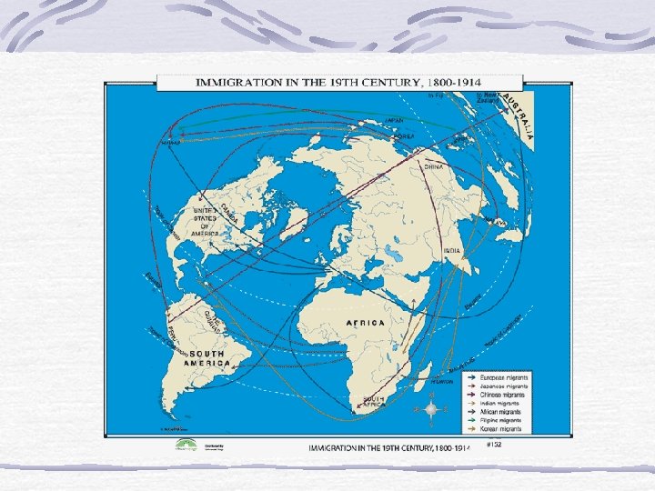 MOVEMENTS • Exchanges of Ideas and Goods • Increased contacts made this inevitable • Modernization came with a Western bias • Modernization often carried with it westernization • Popular Movements • Rural to Urban Migration throughout world • Immigration • European immigration to Americas between 35 -50 million • European population transformed Americas, Oceania • African Slave Trade not abolished until early 1800 s • Africans transported to Americas but also SW Asia, Indian Ocean • Substitute Labor for Plantations • Indians, Chinese, Vietnamese filled need • Often agricultural labor but small business owners, wives followed • Settlement of frontiers • Russians, Americans, Chinese, Boer Afrikaaners, Brazilians, Argentines