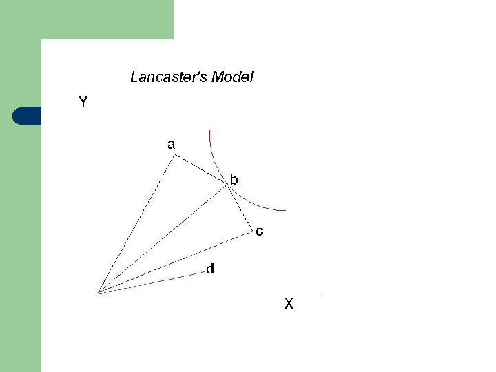 Lancaster’s Model l l Lancaster treated goods as combinations of attributes. The household functions like a firm. l l l If transformation technology fixed If attributes have to be combined in a linear fashion then… The model can be easily represented in Cartesian space.