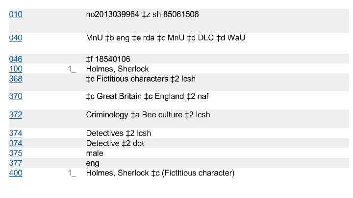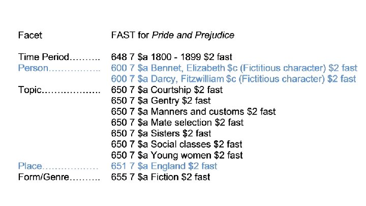 LCSH in MARC Bibliographic Records Headings before conversion 650 10 Bennet, Elizabeth (Fictitious character) $v Fiction. 650 10 Darcy, Fitzwilliam (Fictitious character) $v Fiction. 650 0 Gentry $z England $v Fiction. 650 0 Social classes $z England $v Fiction. 650 0 Young women $v Fiction. 650 0 Mate selection $v Fiction. 650 0 Courtship $v Fiction. 650 0 Sisters $v Fiction. 651 0 England $x Social life and customs $y 19 th century $v Fiction.