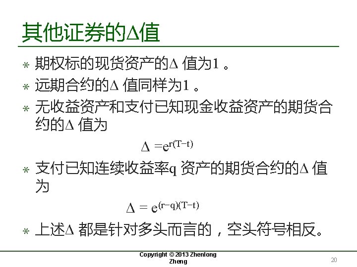 期权Δ值与�� 之间的关系(cont. ) Copyright © 2013 Zhenlong Zheng 19