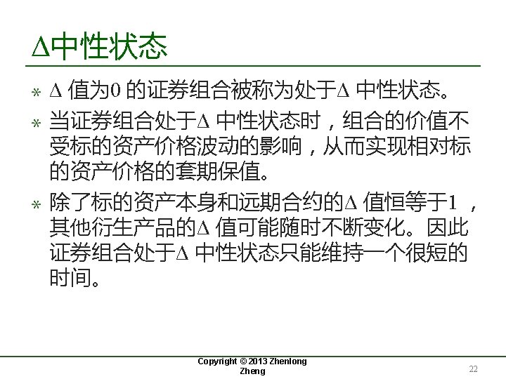 证券组合的Δ值 Copyright © 2013 Zhenlong Zheng 21