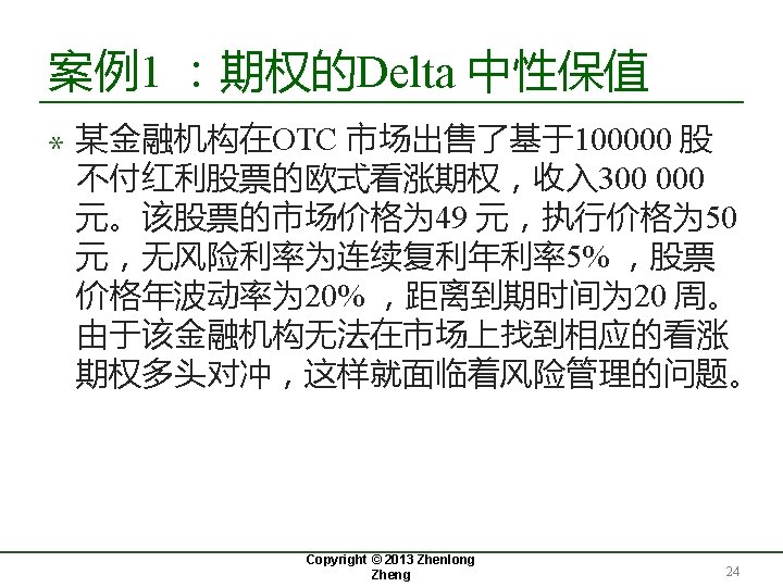 案例1 :期权的Delta 中性保值 (cont. ) 周次 股价 Delta 购买的股 数 成本 (千 累计成本 (千 元) 元) 利息(千 元) 0 49. 00 0. 522 52, 200 2, 557. 8 2. 5 1 48. 12 0. 458 (6, 400) (308. 0) 2, 252. 3 2. 2 2 47. 37 0. 400 (5, 800) (274. 7) 1, 979. 8 1. 9 . . . 19 55. 87 1. 000 1, 000 55. 9 5, 258. 2 5. 1 20 57. 25 1. 000 0 0 5263. 3 Copyright@2013 Zheng Copyright. Zhenlong © 2013 Zhenlong Zheng 26