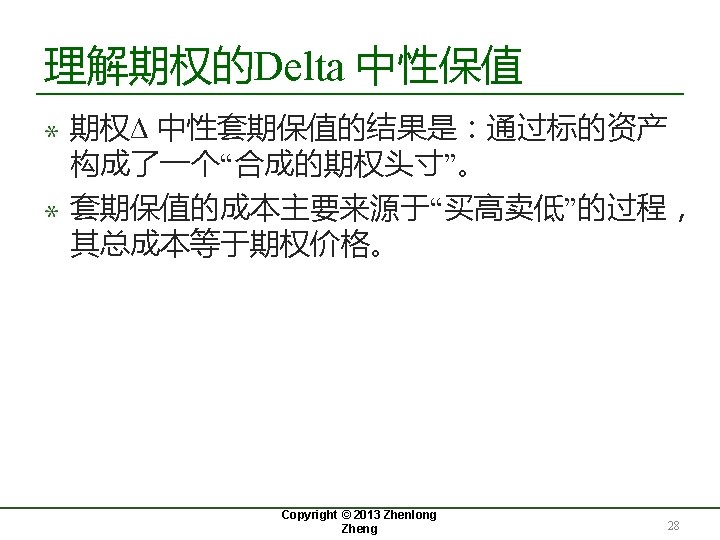 案例1 :期权的Delta 中性保值 (cont. ) 周次 股价 Delta 购买的股 数 0 49. 00 0. 522 52, 200 1 49. 75 0. 568 2 52. 00 . . . . 成本 (千 累计成本 (千 元) 元) 利息(千 元) 2, 557. 8 2. 5 4, 600 228. 9 2, 789. 2 2. 7 0. 705 13, 700 712. 4 3, 504. 3 3. 4 . . 19 46. 63 0. 007 (17, 600) (820. 7) 290. 0 0. 3 20 48. 12 0. 000 (700) (33. 7) 256. 6 Copyright@2013 Zheng Copyright. Zhenlong © 2013 Zhenlong Zheng 27