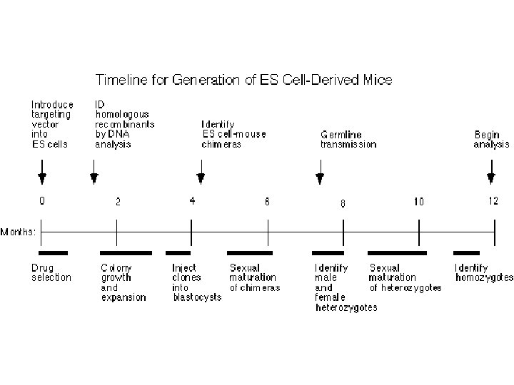 Generation of mutant (chimeric) mouse strain +/+ ES cells from brown mouse electroporate targeting vector homologous recombination +/- ES cells microinjection into black embryo X chimera screen chimera progeny +/+ +/-