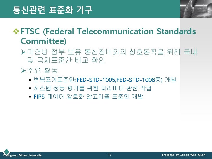 통신관련 표준화 기구 LOGO v IETF(Internet Engineering Task Force) Ø 인터넷의 원활한 실행을 위해 인터넷 표준규격 제정 Ø IAB(Internet Architecture Board) 산하 조사위원회 § IAB 산하의 IESG(Internet Engineering Steering Group)와 함께 새로운 TCP/IP 표준을 개발 ※ IAB : ISOC(Internet Society: 1992. 1 결성)의 자문기구 • 인터넷 구조의 발전과 인터 넷의 원활한 실행을 위한 표준화 ※ RFC(Request For Command) • IETF가 인터넷 관련 기술정 보를 체계적으로 정리해 놓 은 문서 Dongyang Mirae University 13 prepared by Choon Woo Kwon