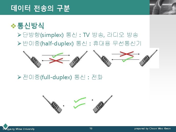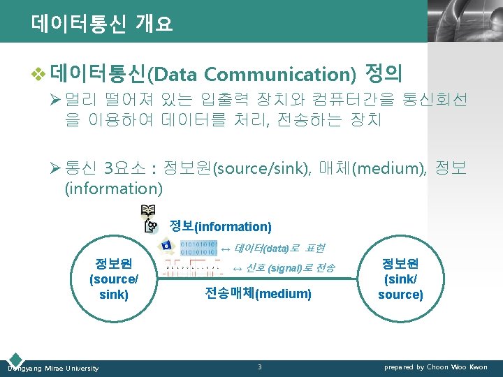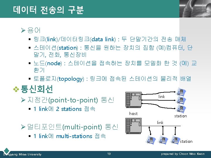 통신관련 표준화 기구 LOGO v IEEE(Institute of Electrical and Electronics Engineers) Ø IEEE 802 표준 위원회 § 근거리 통신망(LAN)에 관한 표준화(ISO OSI 참조모델 하위 2계 층을 대상) v 3 GPP(3 rd Generation Partnership Project) Ø 3세대 GSM 네트워크 및 이를 기초로 한 W-CDMA 접 속기술과 단말기 등 세부규격서 작성 Ø ETSI, ARIB/TTC, T 1, TTA가 결성 Dongyang Mirae University 12 prepared by Choon Woo Kwon