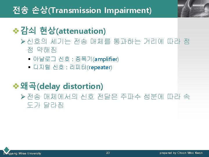 푸리에 변환(Fourier Transform) Time Domain Dongyang Mirae University Frequency Domain Time Domain 22 LOGO Frequency Domain prepared by Choon Woo Kwon