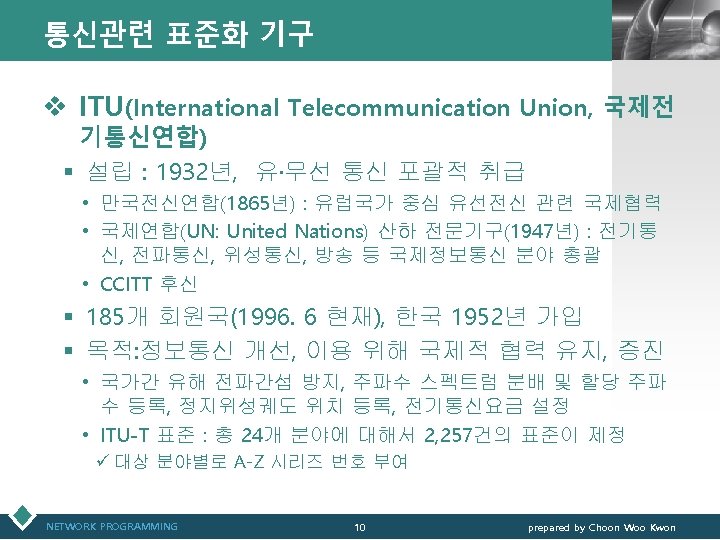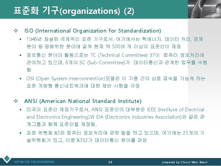 표준화 기구(organizations) (1) LOGO v ITU (International Telecommunication Union) § ITU는 1947년에 UN 산하기관으로 창설되어 ITU-R (Radio Communication Sector), ITU-T (Telecommunication Standardization Sector), ITU-D (Development Sector) 등 세 개의 주요한 섹터로 구성되어 표준화 활동 § ITU-T는 1956년부터 1993년까지 CCITT (International Telegraph and Telephone Consultative Committee)로서 활동 § 전화 전송, 전화교환, 신호방법 등에 관한 여러 표준을 권고하고 있으며, 데이터통 신과 직접 관련이 있는 표준안으로 V시리즈와 X시리즈 등이 있음 § 회원 구성은 4개의 클래스로 구분: 국가의 정부기관으로 구성된 회원(government members), 대표적인 전화 및 컴퓨터 관련 기업, 칩 제작사 등으로 구성되는 섹터 회원(Sector members), 특정 연구 그룹으로 구성되는 연합 회원(associate members), 규제 기관(regulatory agencies) 회원 등 NETWORK PROGRAMMING 85 prepared by Choon Woo Kwon