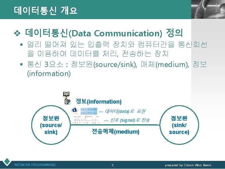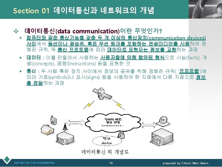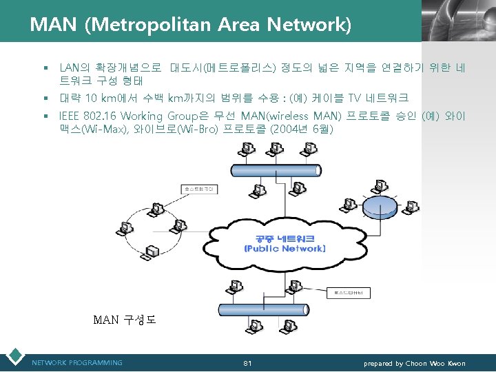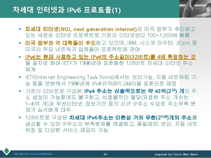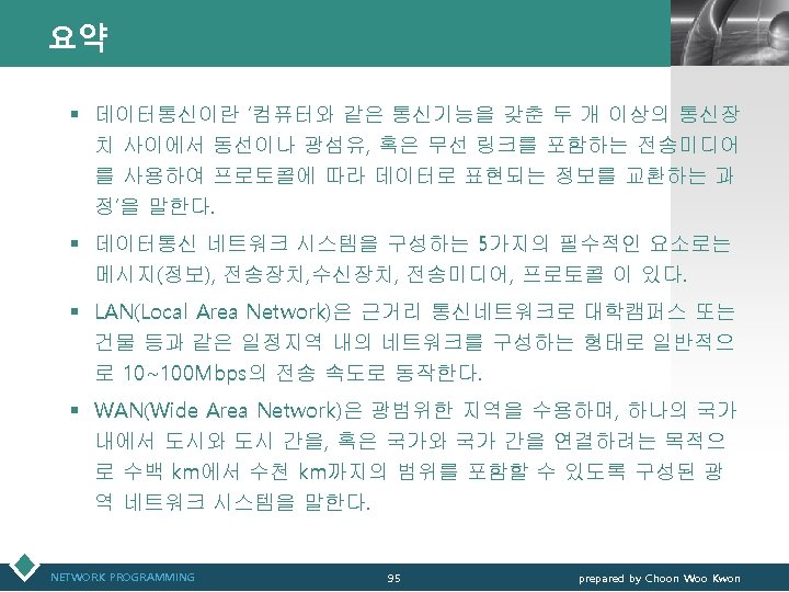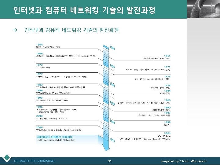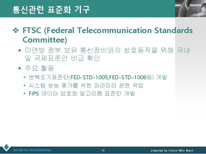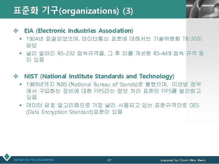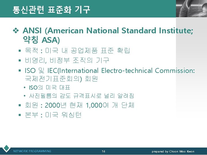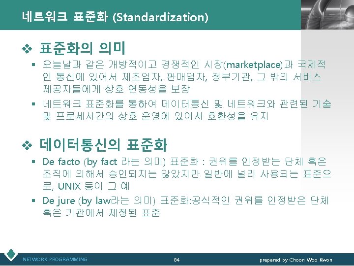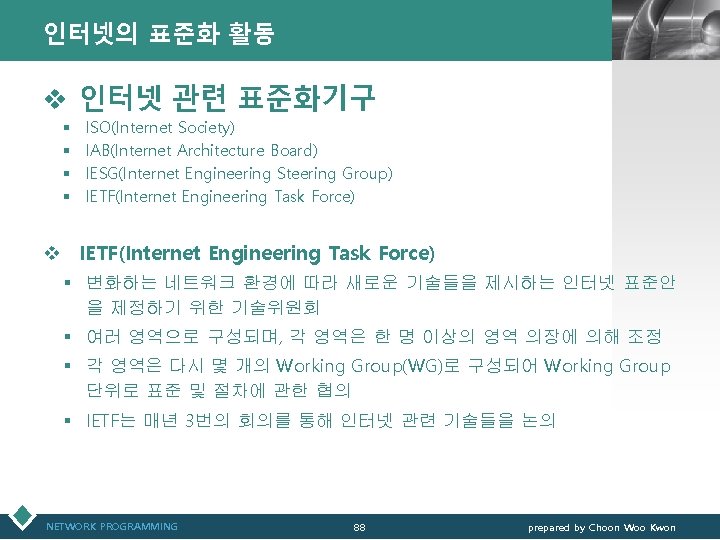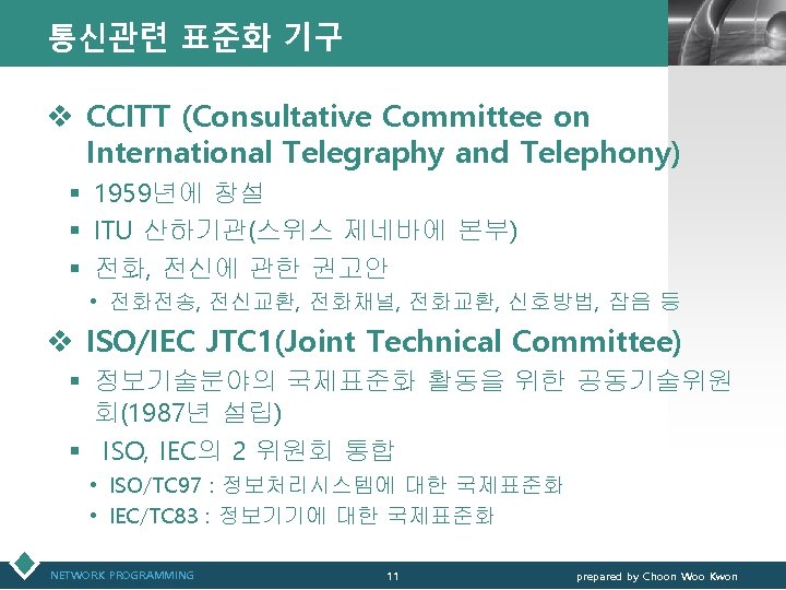 통신관련 표준화 기구 LOGO v IEEE(Institute of Electrical and Electronics Engineers) § IEEE 802 표준 위원회 • 근거리 통신망(LAN)에 관한 표준화(ISO OSI 참조모델 하위 2계 층을 대상) v 3 GPP(3 rd Generation Partnership Project) § 3세대 GSM 네트워크 및 이를 기초로 한 W-CDMA 접 속기술과 단말기 등 세부규격서 작성 § ETSI, ARIB/TTC, T 1, TTA가 결성 NETWORK PROGRAMMING 12 prepared by Choon Woo Kwon