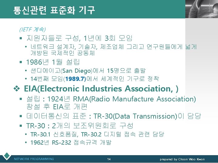 통신관련 표준화 기구 LOGO v IETF(Internet Engineering Task Force) § 인터넷의 원활한 실행을 위해 인터넷 표준규격 제정 § IAB(Internet Architecture Board) 산하 조사위원회 • IAB 산하의 IESG(Internet Engineering Steering Group)와 함께 새로운 TCP/IP 표준을 개발 ※ IAB : ISOC(Internet Society: 1992. 1 결성)의 자문기구 • 인터넷 구조의 발전과 인터 넷의 원활한 실행을 위한 표준화 ※ RFC(Request For Comment) • IETF가 인터넷 관련 기술정 보를 체계적으로 정리해 놓 은 문서 NETWORK PROGRAMMING 13 prepared by Choon Woo Kwon