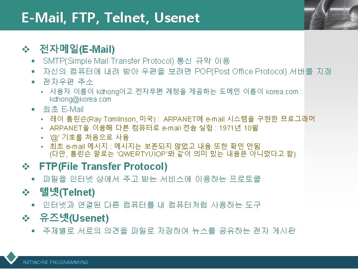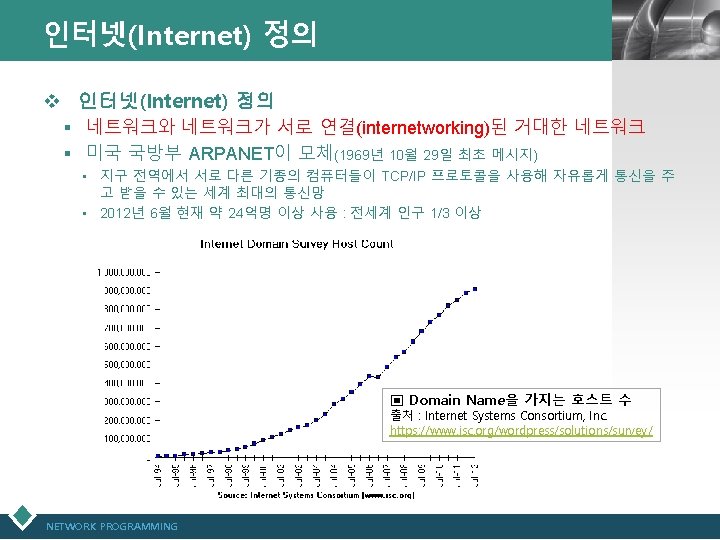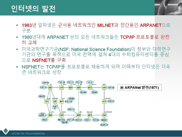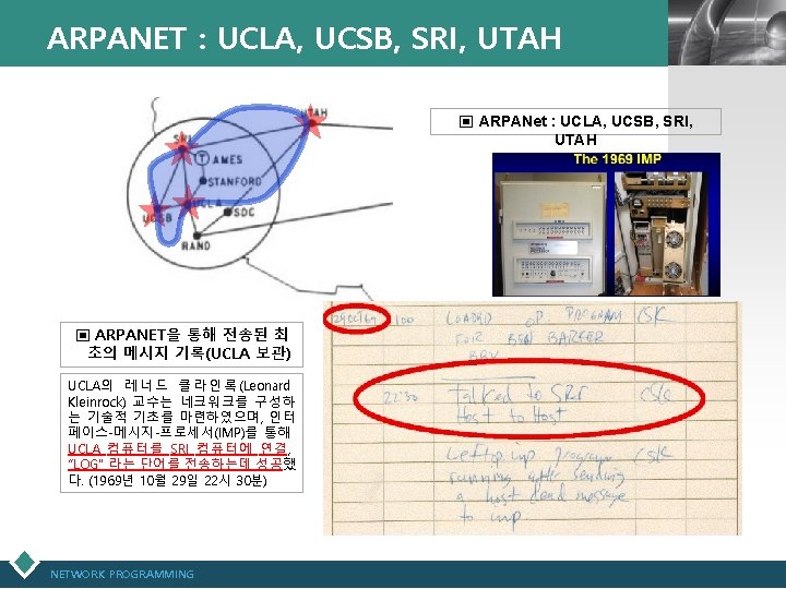 인터넷 최초의 전송 메시지 : “LOG(x)” LOGO ▣ “Realizing the Wireless Internet” 중에서 (2007년 3월 13일 홍콩에서 인터넷 기술의 발명 가라고 불리우는 Leonard Kleinrock -UCLA 교수, ARPANET 개발자- 발표자료) (원문) http: //www. lk. cs. ucla. edu/data/files/Kleinrock/slides /Realizing%20 the%20 Wireless%20 Internet. pdf ▣ UCLA 교수 Leonard Kleinrock 발표자료, 2012년 4월 23일) (원문) http: //www. elon. edu/eweb/predictions/isoc_20 th_2012/leonard_kleinr ock_keynote. xhtml? m=1 NETWORK PROGRAMMING