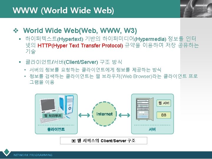 인터넷개요 § What is the Internet? • • • 통신(communication)이다? 네트워크(network)이다? 웹(web, www; world wide web)이다? e-mail이다? 정보의 바다이다? 사용하기 쉽게 한 컴퓨터 네트워크이다? HTML? CSS? ASP? JAVASCRIPT? § Internet is • • 네트워크와 네트워크가 서로 연결된 거대한 네트워크 Internetworking = Inter + Networking NETWORK PROGRAMMING LOGO
