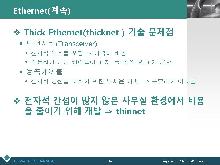 Ethernet(이더넷) LOGO § Thick Ethernet : 초기 Ethernet 기술 • 동축케이블 : 지름 ½”, 10 BASE 5(10 Mbps, baseband, 500 m까지) • Transceiver : MAU(Medium Attachment Units) • AUI(Attachment Unit Interface) : D-connector(15 pin) NETWORK PROGRAMMING 34 prepared by Choon Woo Kwon