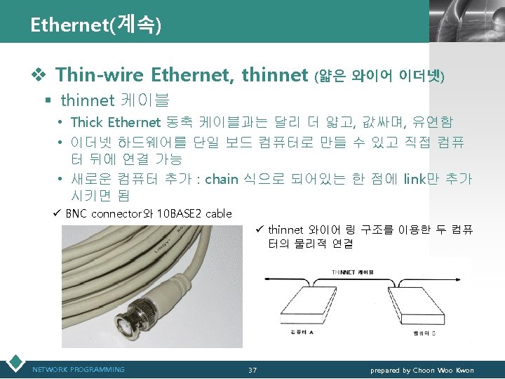 Ethernet Implementation(이더넷 구현) LOGO v 10 BASE 2 : thin Ethernet NETWORK PROGRAMMING 49 prepared by Choon Woo Kwon