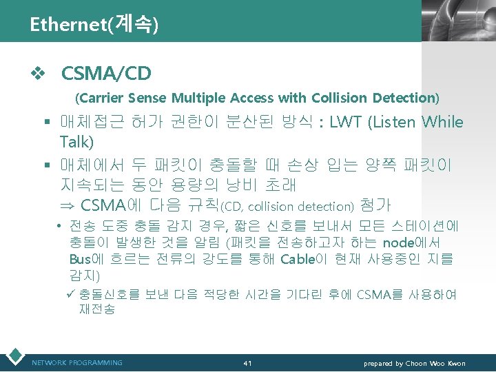 Ethernet(계속) LOGO v CSMA/CD 매체접근방법에서의 충돌 (Carrier Sense Multiple Access with Collision Detection) NETWORK PROGRAMMING 42 prepared by Choon Woo Kwon